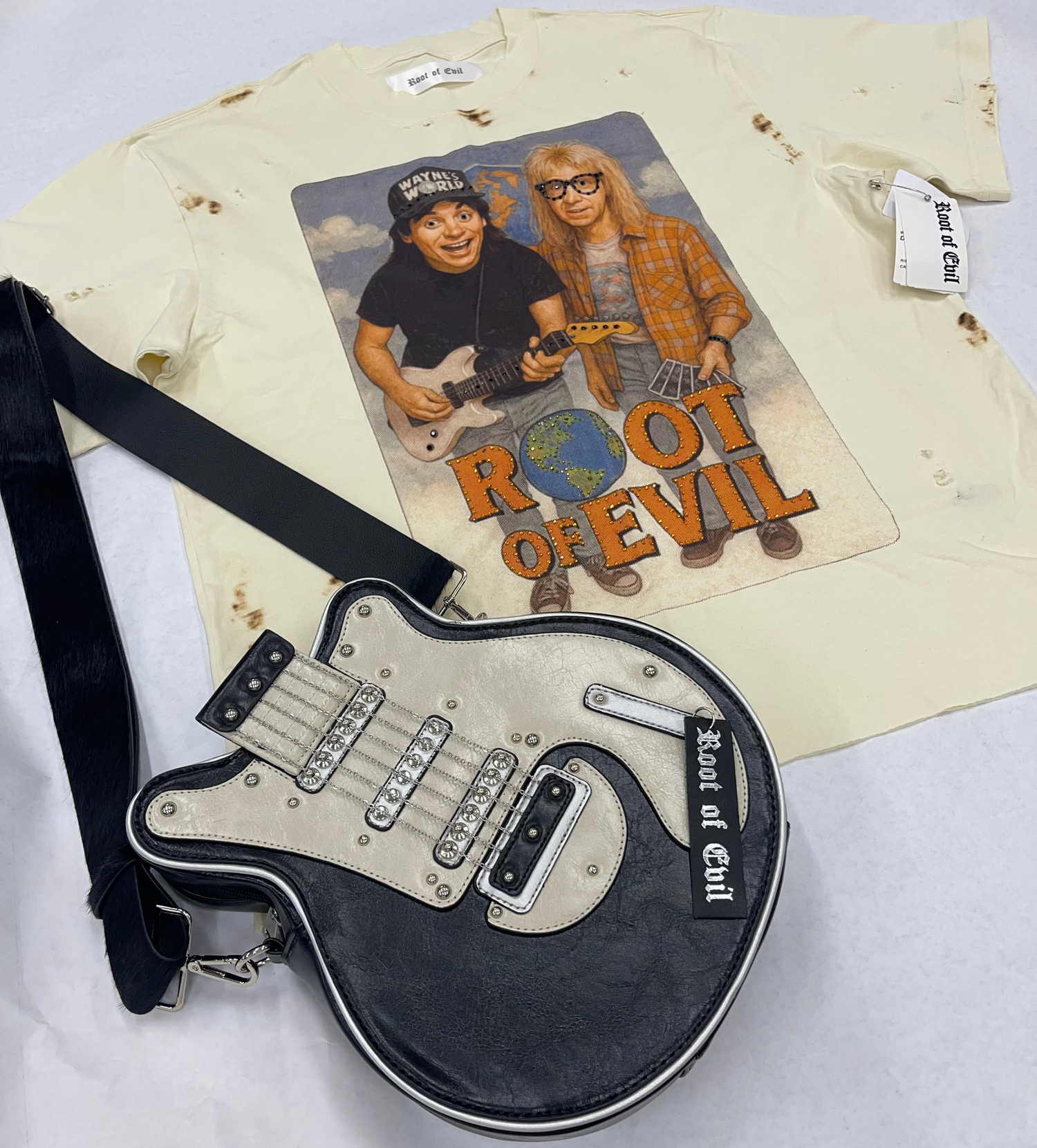 A rare twist on a 90's classic, this tee flips is the iconic Wayne's World logo into Root of Evil. Designed with heavy distressing, authentic burn marks and rips for a true vintage edge.