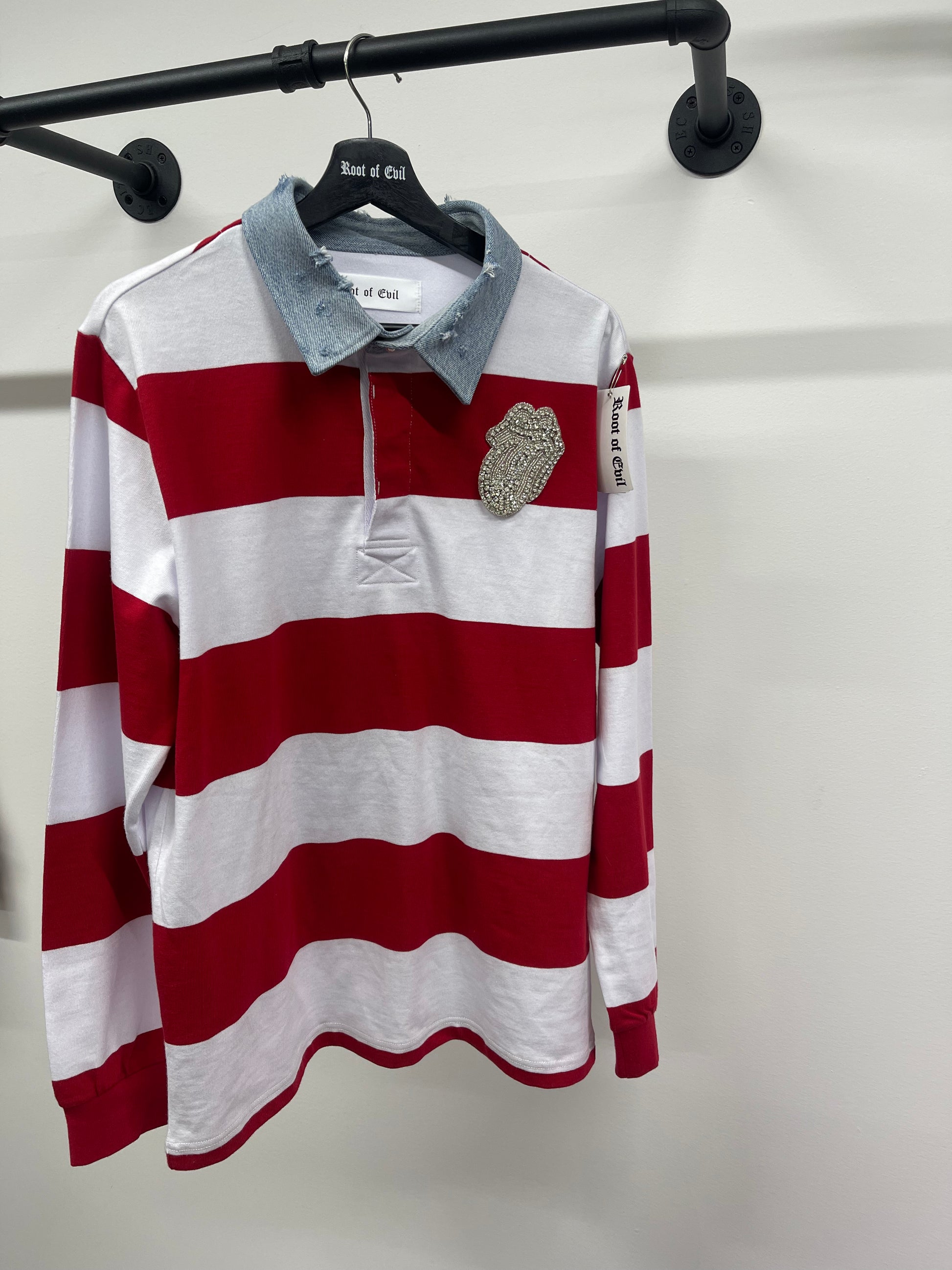 The Root of Evil Crystal Rugby is a premium striped rugby shirt featuring a denim collar and hand-set crystal detailing. Built from heavyweight cotton with a classic fit and signature Root of Evil branding. A bold statement piece with luxury street character.